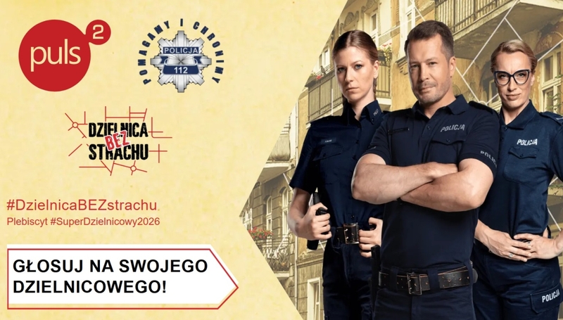 Od 16.02.2026 r., można oddawać głosy na swojego dzielnicowego! Komenda Główna Policji, Telewizja Puls oraz ekipa serialu kryminalnego „Dzielnica strachu” wkraczają do akcji i po raz czwarty, w ramach kampanii społecznej #DzielnicaBEZstrachu, prowadzą internetowy plebiscyt, którego celem jest promowanie bezpieczeństwa i współpracy lokalnych społeczności z dzielnicowymi oraz wyłonienie #SuperDzielnicowego 2026. W tym roku Plebiscyt odbywa się w świetle szczególnej rocznicy, jaką jest 100 lat służby dzielnicowych w Polsce!