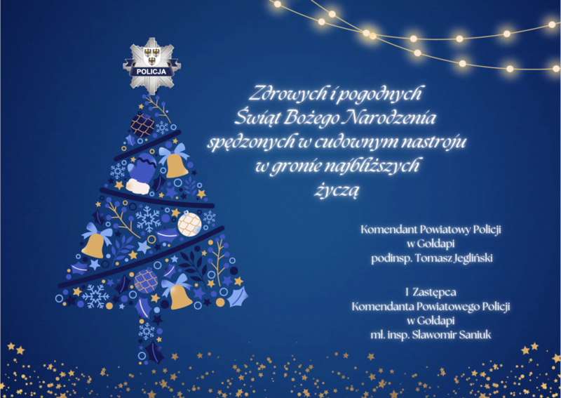 Z okazji Świąt Bożego Narodzenia i Nowego Roku Komendant Powiatowy Policji podinsp. Tomasz Jegliński wraz z Zastępcą oraz policjantami i pracownikami cywilnymi gołdapskiej komendy składa życzenia wszystkim mieszkańcom naszego powiatu.