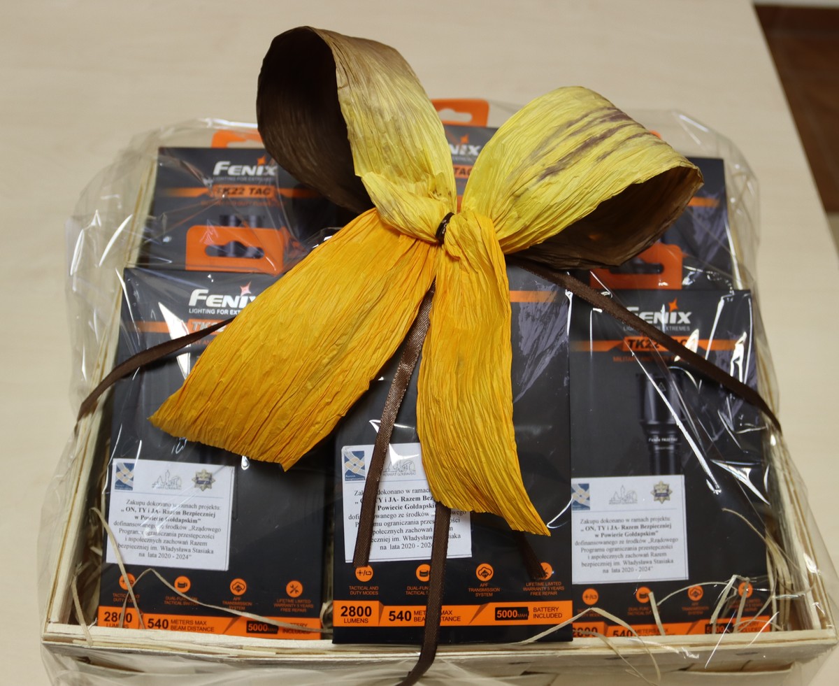 Potrzebę wsparcia policjantów w nowoczesny sprzęt dostrzegło Starostwo Powiatowe w Gołdapi, które w ramach projektu „On, Ty i Ja – razem bezpieczniej w powiecie Gołdapskim” dofinansowanemu przez Rządowy Program Ograniczenia Przestępczości i Aspołecznych Zachowań Razem Bezpieczniej im. Władysława Stasiaka na lata 2022-2024 zakupiło 7 specjalistycznych taktycznych latarek. W środę (30.11.2022r.) Starosta Gołdapski Marzanna Marianna Wardziejewska oraz Wicestarosta Gołdapski Andrzej Ciołek wręczyli na ręce Komendanta Powiatowego Policji w Gołdapi insp. dr Dariusza Stachelka zakupiony sprzęt. Latarki trafią do policjantów ruchu drogowego, gdzie będą wykorzystywane w codziennej służbie i w znacznym stopniu poprawią warunki i bezpieczeństwo pracy funkcjonariuszy. Znajdą one swoje zastosowanie podczas kierowania ruchem, przy zatrzymywaniu pojazdów do kontroli oraz na miejscu różnego rodzaju zdarzeń. Niewątpliwie będą doskonałym narzędziem, które przyczyni się do usprawnienia działań na rzecz bezpieczeństwa w ruchu drogowym.