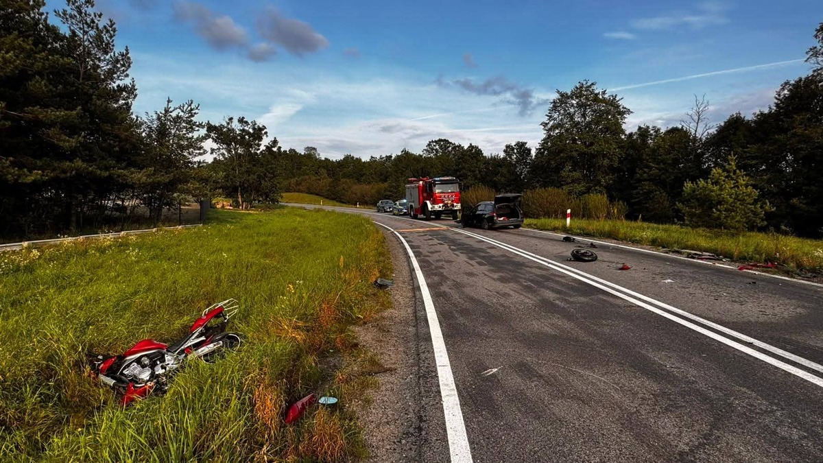 Z ustaleń mundurowych wynika, że 40-letni motocyklista jadąc z Gołdapi w kierunku Bań Mazurskich z nieustalonych dotąd przyczyn zjechał na przeciwległy pas ruchu i uderzył w prawidłowo jadącego citroena, którym podróżowały dwie osoby. Kierowca jednośladu został przetransportowany do szpitala w Giżycku natomiast kierowcy i pasażerce auta na szczęście nic poważnego się nie stało. Obaj kierujący byli trzeźwi. Droga w tym miejscu przez kilka godzin była zablokowana.