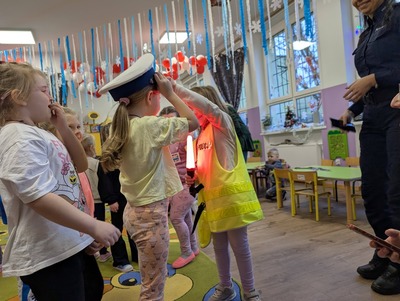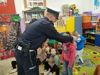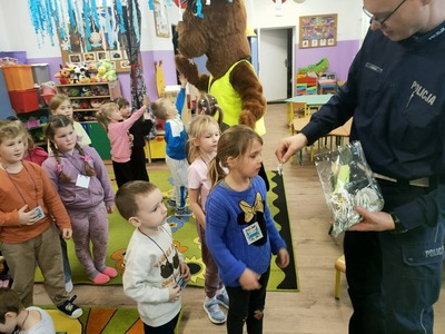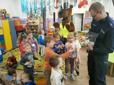 Spotkanie stanowiło też świetną okazję do przypomnienia najmłodszym o podstawowych zasadach bezpieczeństwa. Policjant - tata rozmawiał o bezpiecznym zachowaniu na drodze. Na koniec wizyty wręczył przedszkolakom zawieszki odblaskowe oraz przypomniał jak ważną rolę spełniają elementy odblaskowe.