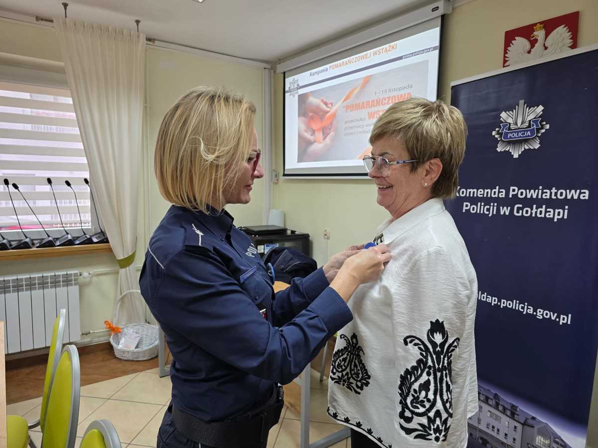 Dodatkowo, z uwagi na to, że co roku przez 19 pierwszych dni listopada na całym świecie trwa Kampania Pomarańczowej Wstążki, asp. Anna Wąsowicz przybliżyła zebranym gościom założenia trwającej kampanii raz wręczyła broszki z charakterystyczną dla akcji pomarańczową wstążką.
