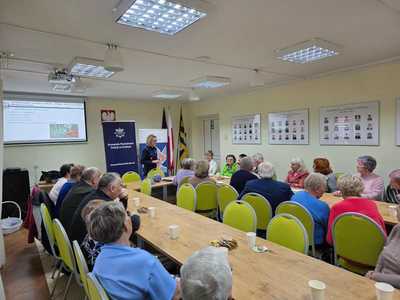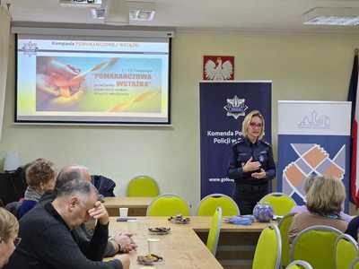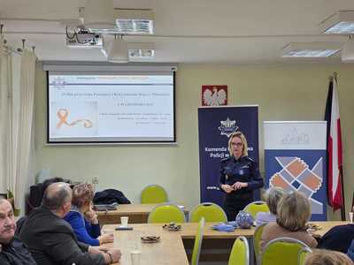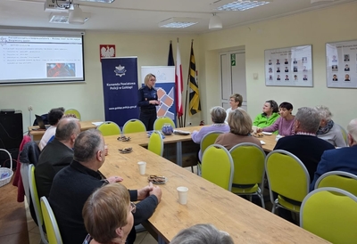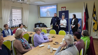 W poniedziałek (17.11.2025 r.) gołdapscy policjanci zorganizowali i przeprowadzili debatę społeczną pn.: "Bezpieczny senior - nie daj się oszukać", która odbyła się w Starostwie Powiatowym w Gołdapi. Funkcjonariusze spotkali się z Seniorami Sekcji Emerytów i Rencistów Związku Nauczycielstwa Polskiego oraz Związku Emerytów, Rencistów i Inwalidów w Gołdapi. Swoją obecność zaznaczyli również pracownicy Ośrodka Pomocy Społecznej w Gołdapi. Spotkanie poświęcone było różnego rodzaju oszustwom, na które mogą być narażone osoby starsze.