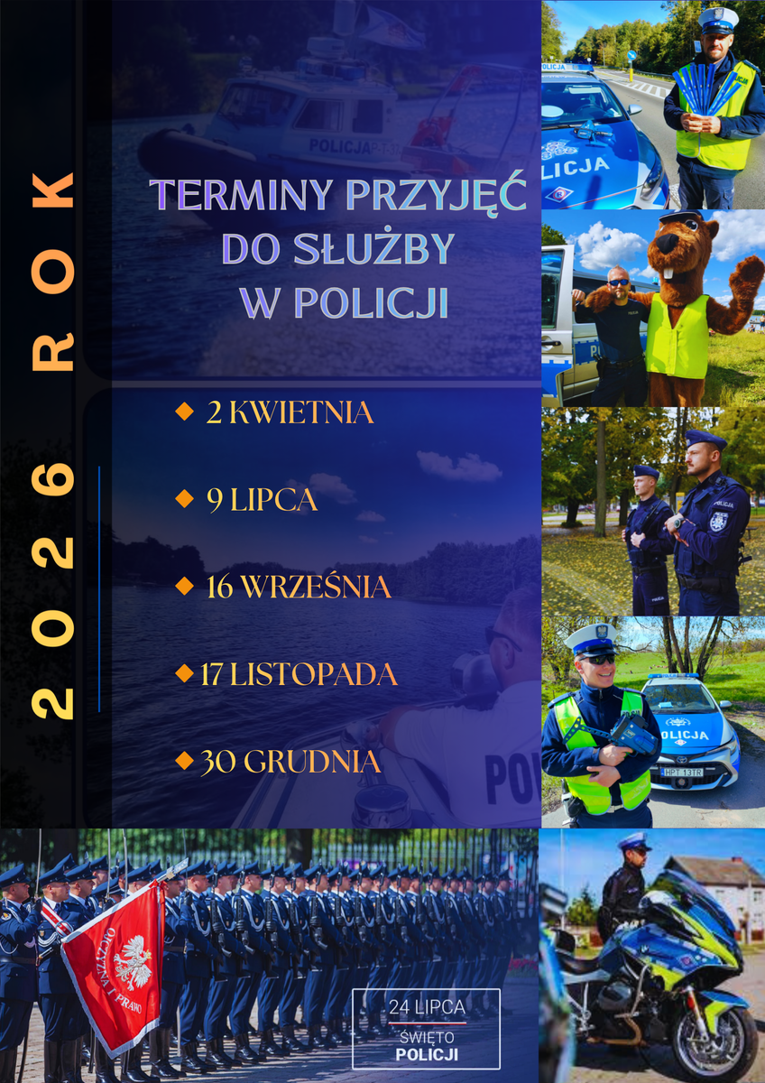 Znamy już terminy przyjęć do służby w Policji w roku 2026. Zachęcamy osoby zainteresowane służbą w naszej formacji, do zapoznania się z wymaganiami dla kandydatów. Procedurę naboru rozpoczyna złożenie stosownych dokumentów, a następnie pozytywne przejście pozostałych etapów rekrutacji.