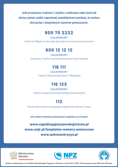 Pamiętajmy! Osoby przeżywające trudności emocjonalne nie są same i mogą szukać wsparcia między innymi na infoliniach organizacji i instytucji zajmujących się pomocą osobom przechodzącym trudne chwile. Pomocy na terenie całego kraju można szukać, dzwoniąc pod numer alarmowy 112 lub Kryzysowy Telefon Zaufania pod nr 116 123 i Młodzieżowy Telefon Zaufania 116 111.