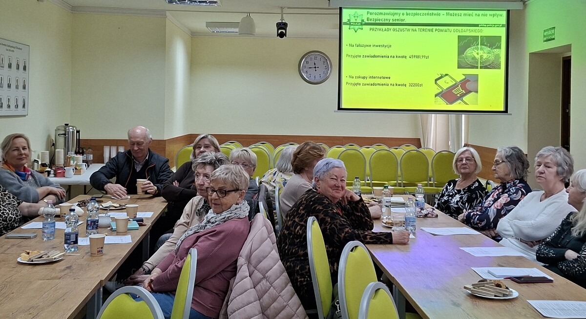 Porozmawiajmy o bezpieczeństwie – możesz mieć na nie wpływ. Profilaktyczne spotkanie z najstarszymi mieszkańcami miało na celu zwiększenie świadomości cyfrowej seniorów. Policjanci starali się ostrzec seniorów oraz spowodować uwrażliwienie na zagrożenia płynące z Internetu. Funkcjonariusze przedstawili sposoby oraz wyrafinowane algorytmy postępowania cyberprzestępców. Podczas debaty uczestnikom przedstawiono prezentację multimedialną i omówiono najczęstsze metody oszustw do których doszło na terenie powiatu gołdapskiego. Zwrócono uwagę na występujące często fałszywe telefony, wiadomości sms i e-maile wyłudzające dane osobowe oraz dostęp do kont bankowych.