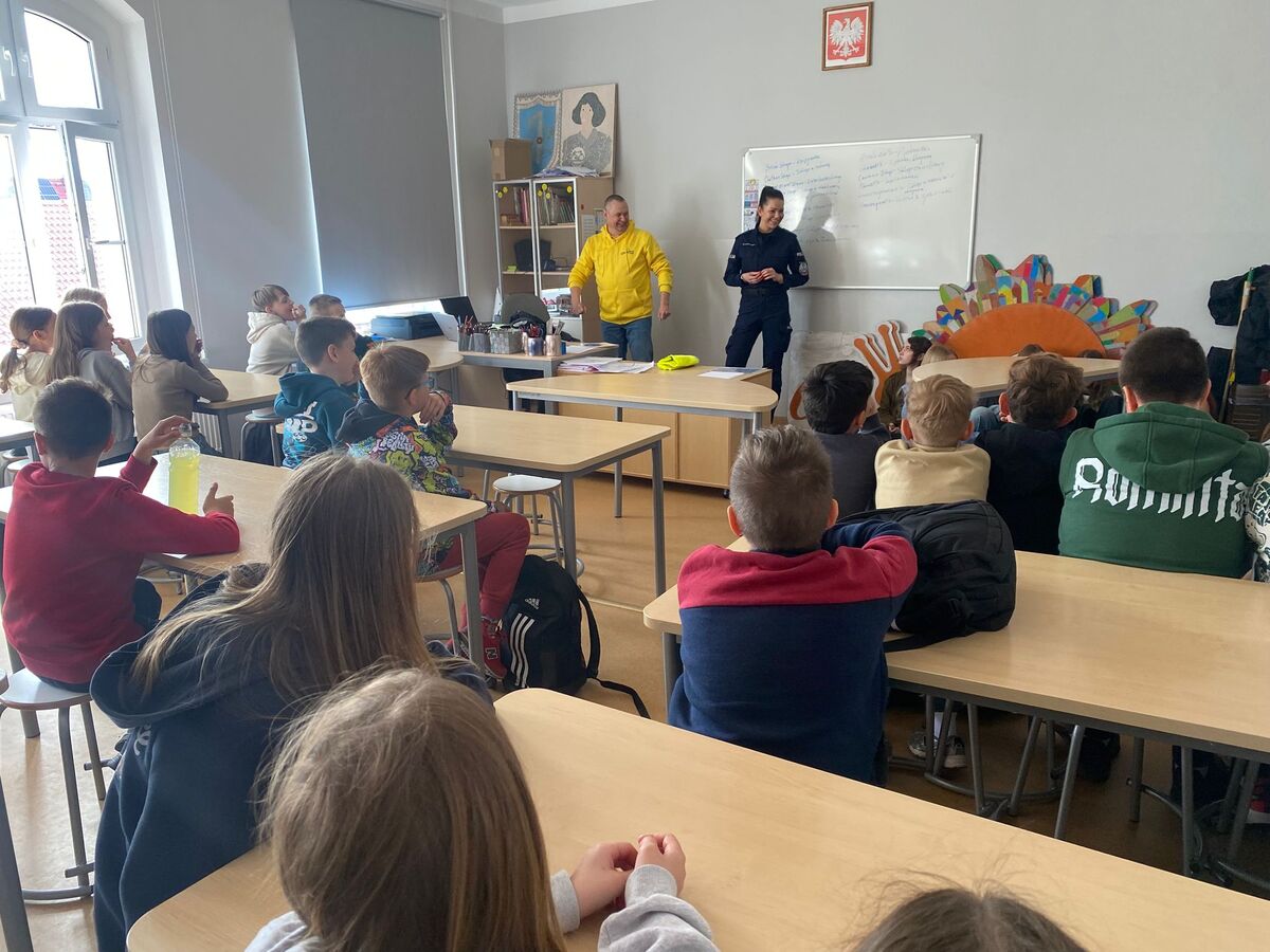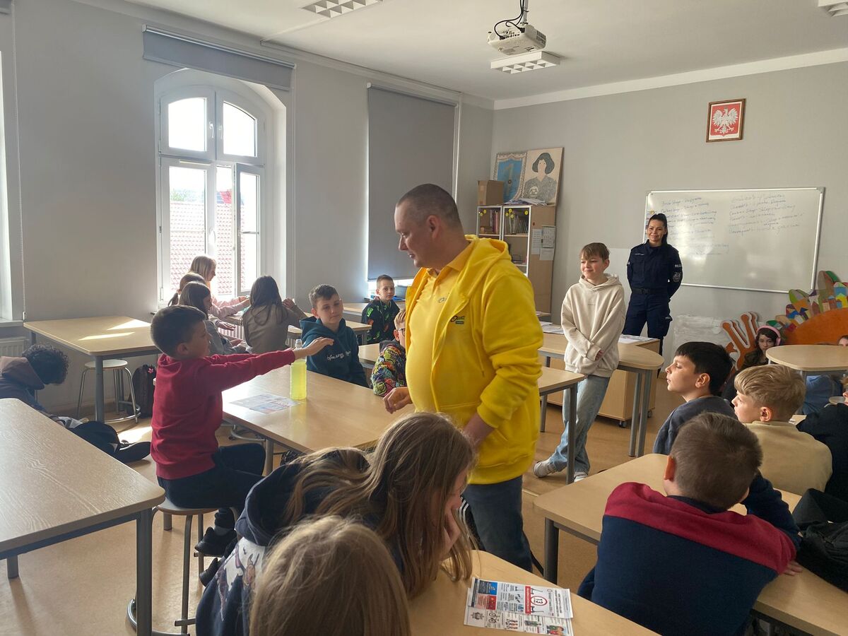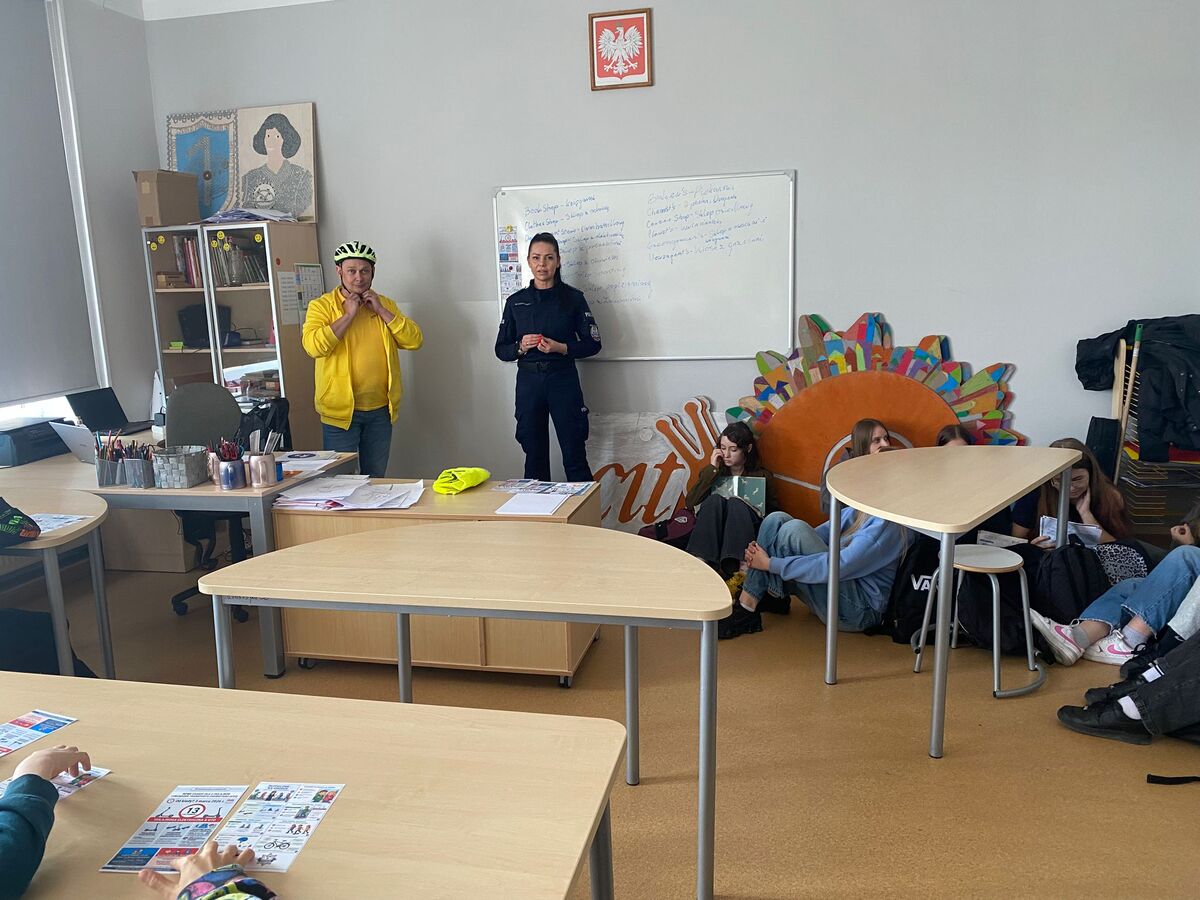 Nie zabrakło również informacji o obowiązujących przepisach oraz nadchodzących zmianach – w tym dotyczących korzystania z hulajnóg i obowiązku używania kasków ochronnych. Uczniowie chętnie uczestniczyli w rozmowie, dzieląc się swoimi spostrzeżeniami i zadając pytania.