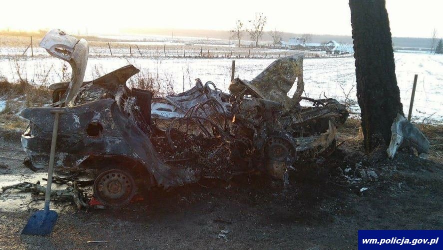 Dzisiaj kilka minut po godzinie 2.00 w nocy w okolicach miejscowości Karwiny w gminie Wilczęta, w powiecie braniewskim kierujący renault megane z nieustalonych przyczyn uderzył w przydrożne drzewo. W konsekwencji auto stanęło w płomieniach. Po akcji gaśniczej przeprowadzonej przez strażaków w pojeździe znaleziono ciała 5 osób.