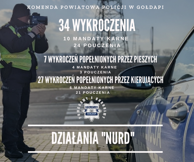 - Podsumowanie policyjnych działań „NURD” W czwartek gołdapscy policjanci Zespołu Ruchu Drogowego objęli szczególnym nadzorem rejony przejść dla pieszych oraz przejazdy dla rowerów. Wojewódzkie działania pod nazwą „Niechronieni Uczestnicy Ruchu drogowego” miały na celu ograniczenie ilości zdarzeń z udziałem tej kategorii uczestników ruchu drogowego. Mundurowi w trakcie akcji ujawnili ogółem blisko 40 wykroczeń.